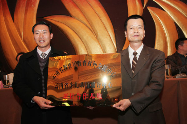 云南省教育廳外事處調研員、基因測評中心主任劉超(右)向安寧市好孩子教育培訓學校校長魯植(左)授牌