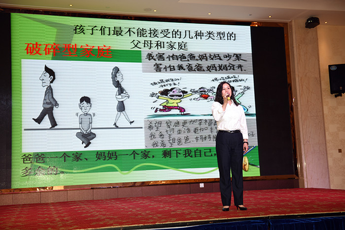 周老師本次培訓的主題是《父母執照—成為合格的父母》。父母作為孩子的人生啟蒙者,所擔負的教育意義不言而喻,而孩子的每個成長階段都需要家長積極地介入和引導。周老師引用了社會學家埃里克森著名的“成長需要”理論闡述了孩子最重要的五個成長階段,如果孩子沒有在某個階段充分成長,那么孩子將來的生活中就會感到困擾甚至是無能為力。如果孩子在每一階段都得到肯定和滿足,孩子的感受都能得到理解,孩子就會成為一個身心健康、接受自己的人。反之,孩子會形成反叛個性,成為人們眼中“最難教育的孩子”。周老師用通俗易懂的語言和形象生動的圖片向家長們呈現了一幕幕家庭教育案例,引導家長正確識別和認知家庭教育的缺失和偏頗,讓家長們領悟正確的教育方式是孩子健康成長的決定性因素。好父母是學出來的、好孩子是教出來的、好習慣是養出來的、好溝通是聽出來的,和孩子建立和諧的親子關系,是靠平時在生活中一點一滴的累積,而不是一蹴而就的。沒有天生成功的父母,也沒有不需要學習的父母。雖然做父母的確不需要考個執照,但是,如果不學習,就不可能成為一個合格的父母!周老師用感人肺腑的語言,朗讀了孩子寫給家長的信,深深感動了在場的家長們,多次熱烈的掌聲和感同身受留下的淚水把培訓會氣氛推到了一個高點。