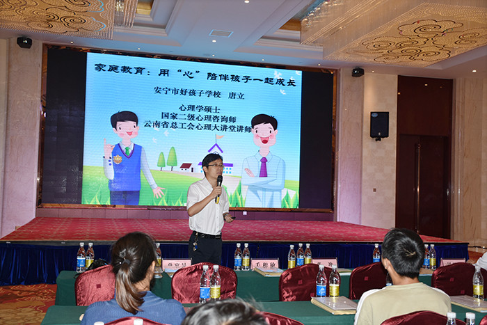 本次家長培訓會學校派出了學校副校長、國家二級心理咨詢師周榕樺老師和學校心理學碩士、國家二級心理咨詢師、云南省總工會心理大講堂講師唐立向參加培訓的家長們進行現場授課。