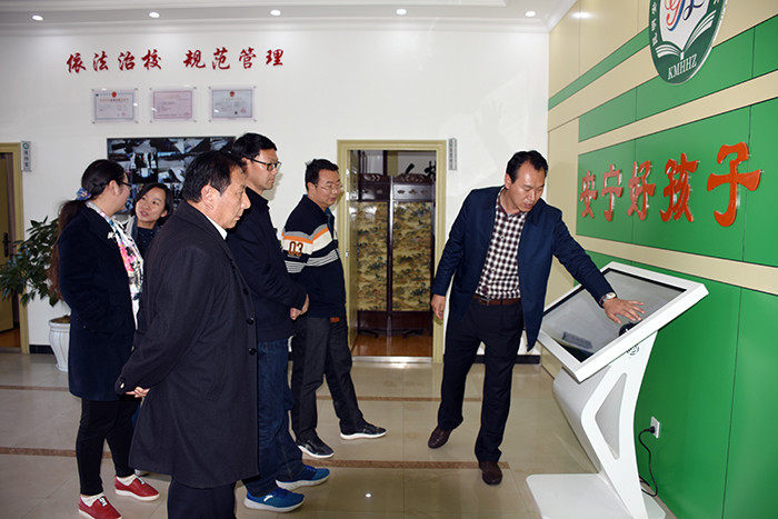 毛局長一行在的陪同下,依次參觀了學校辦公樓、監控安防設備、食堂餐廳、學生宿舍、心理輔導室等,還特地查閱了學校心理輔導工作記錄情況,并與心理輔導老師們進行了工作交流;隨后,在多媒體教室觀看了教學活動短片。