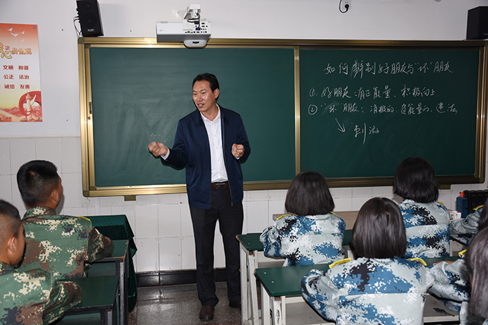 杜記者一行邊走邊看邊拍,從辦公樓到教學(xué)樓、從食堂到宿舍、從操場(chǎng)到教室,全方位、多角度地拍攝,無(wú)不被學(xué)校獨(dú)具特色的辦學(xué)模式、精細(xì)化的教學(xué)管理、精彩紛呈的德育活動(dòng)、濃厚溫馨的育人氛圍和豐碩的教學(xué)成果所打動(dòng)。走到心理輔導(dǎo)室門(mén)口,看著心理輔導(dǎo)老師在給學(xué)生做“一對(duì)一”心理輔導(dǎo),杜記者在不打擾的情況下進(jìn)行拍攝,并在另一間心理輔導(dǎo)的沙盤(pán)面前停留很久。與此同時(shí),魯校長(zhǎng)也悄悄走到教室,查看孩子們的學(xué)習(xí)情況。不看還好,一看卻再也忍不住腳步,情不自禁走進(jìn)去和孩子們親切交談,語(yǔ)重心長(zhǎng)地聊起了“如何辨別好朋友與壞朋友”,孩子們紛紛爭(zhēng)相發(fā)言,表明觀點(diǎn),大聲說(shuō)出好朋友就是積極的、可愛(ài)的、身心健康的、能共同成長(zhǎng)的、有正能量的等觀點(diǎn),看著孩子的成長(zhǎng),魯校長(zhǎng)甚是欣慰,或許這就是刻在骨子里的教育情節(jié)。這一畫(huà)面,也被杜記者默默記錄。