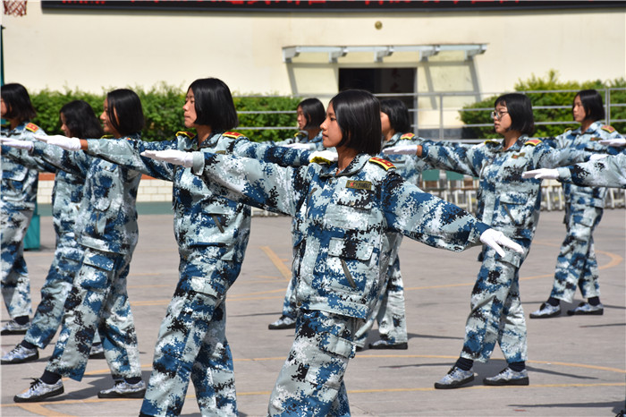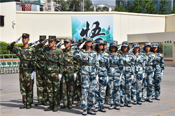 參觀結束,全體人員在操場集合。國旗手英姿颯爽、精神抖擻地入場,進行了莊嚴的升國旗儀式,師生們軍容嚴整,行著標準的軍禮注視著五星紅旗冉冉升起。隨后,軍事匯報表演在迎校旗中拉開序幕。
