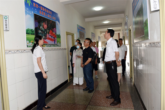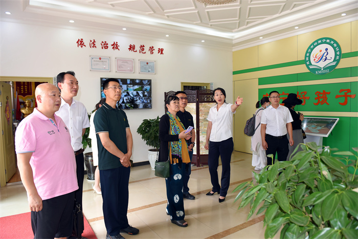 許秘書長一行懷著對學校的關心、關切之情,在校領導的陪同下,首先深入學校的辦公樓、教學樓、宿舍樓、食堂、心理輔導室等地進行參觀。隨后在多媒體教室觀看了學校教學活動短片,更直觀、全面地對學校進行了解。其間,李新紅副校長向許秘書長一行介紹了學校的辦學情況,訪問組一行連連稱贊學校是在做有情懷的教育,為社會傳播了很多正能量。隨后,領導們還親切走到孩子們身邊合影留念。