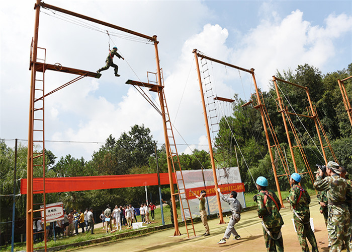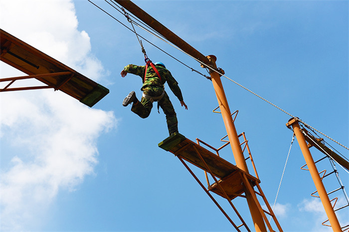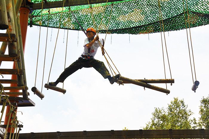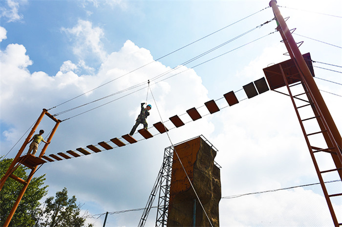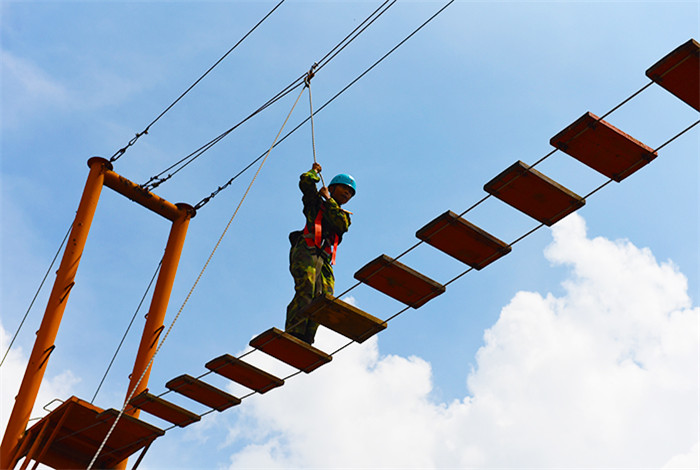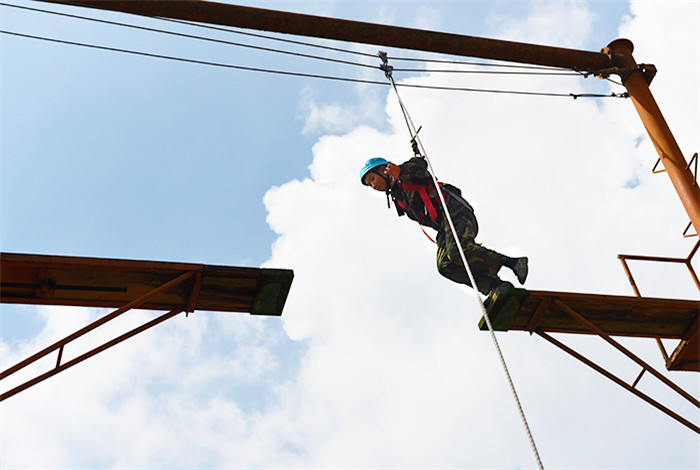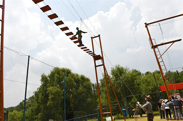拓展活動在教練們的耐心講解和簡短的趣味游戲熱身中拉開了帷幕。隨后,同學(xué)們陸續(xù)挑戰(zhàn)了天梯、高空斷橋、探險樂園等30余個項目。