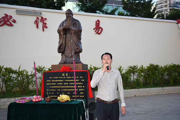 晚餐前,全體師生莊嚴地站在操場上,跟隨魯植校長一起祭拜孔子雕像。魯校長說道:“祭拜孔子雕像,不僅僅要表達對孔子的崇敬之情,更在于可以時時刻刻提醒我們要立德修身、勤而好學,繼承和發揚中華民族的優良傳統。我們要以孔子的智慧和人格為標尺,丈量每天的進步與成長,去遇見更好的自己。”在莊重而簡樸的儀式下,孩子們深切感受到了傳統文化的魅力。