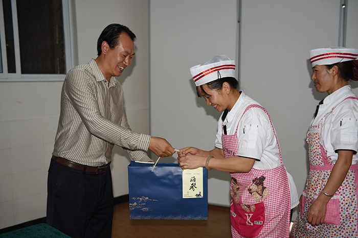 全體師生向孔子像行完鞠躬禮后,進入食堂,準備享用美味。副校長毛積敏擔任了本次活動的主持人,首先給孩子們介紹了中秋節的來歷及習俗,隨后魯校長作了中秋致辭,并陪著大家一起共進晚餐,師生們紛紛舉杯相互表達節日祝福。為感謝幾年如一日、無怨無悔扎根于學校的老師們,魯校長精心準備,給全體教職工發放了精美禮品進行慰問。席間,孩子們迫不及待、自告奮勇上臺自我介紹或表演節目,把晚餐的氣氛推向了高潮。