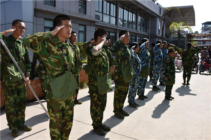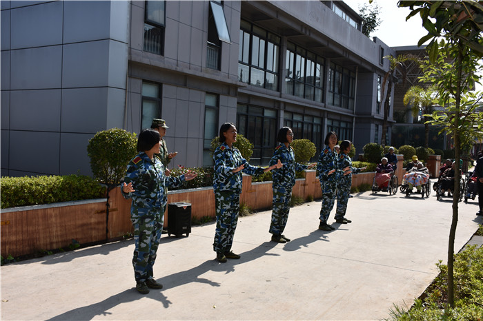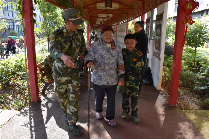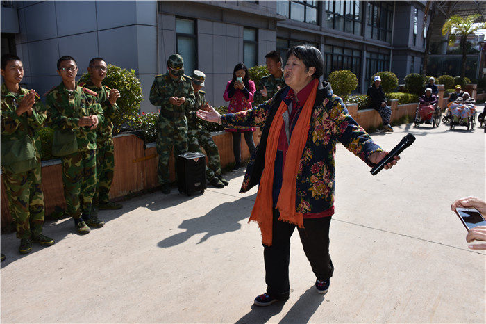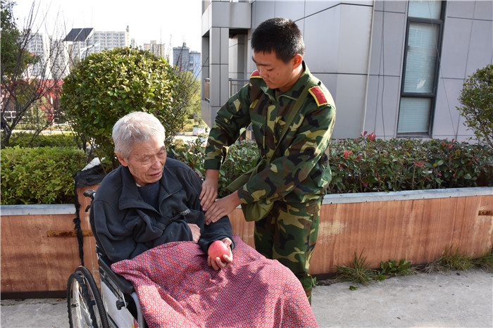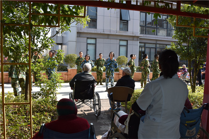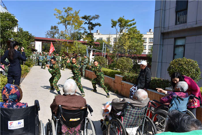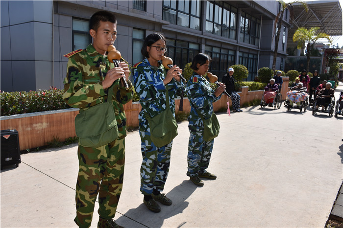 到了敬老院同學們立馬給老人們送上了蘋果,還主動到老人身邊扶著老人散步、推著輪椅陪老人看風景、陪老人們聊天、給老人們按摩,一張張稚嫩的笑臉和一雙雙慈祥的目光碰撞出“家”一樣的和諧、溫馨。聽說老人們喜歡看表演,孩子們就為老人們唱起了軍歌、表演了軍體拳、跳手語舞、演奏葫蘆絲等。豐富的節目博得了老人們的好評,掌聲不斷響起,幾位老奶奶也開心地送上了自己的拿手表演,整個院兒里充滿了掌聲和歡笑聲。