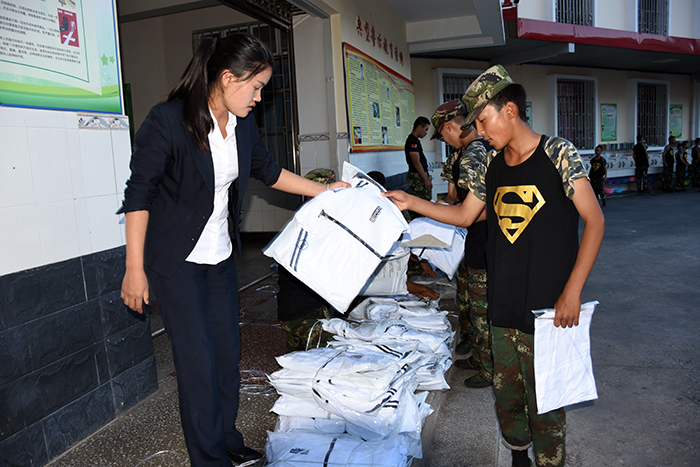 領到新裝的孩子非常興奮,不時說著“真好看”、“好喜歡”、“好漂亮”、 “太幸福了”之類的話語,并迫不及待地換上漂亮的校服,站在鏡子面前,左照照、右照照,是那么合身、那么帥氣、那么有朝氣。你瞧,潔白的T恤和外套,配上黑色的褲子,加上白色運動鞋,既莊重又活潑,既樸素又大方。我校使用的迷彩服和運動服作為指定服裝,相得益彰,一個嚴肅,一個休閑,正好符合學校的“嚴管理,善對待”的教學理念,更體現了學校的人文關懷。