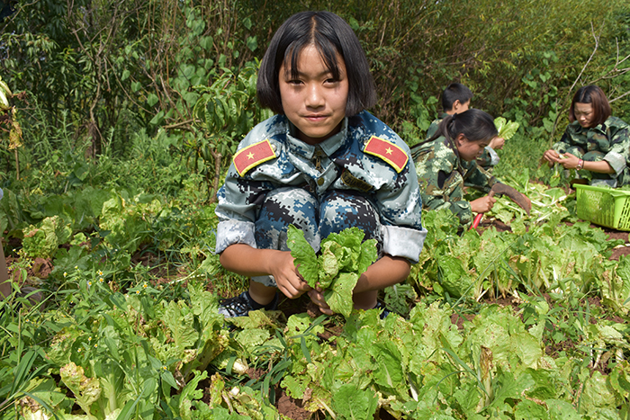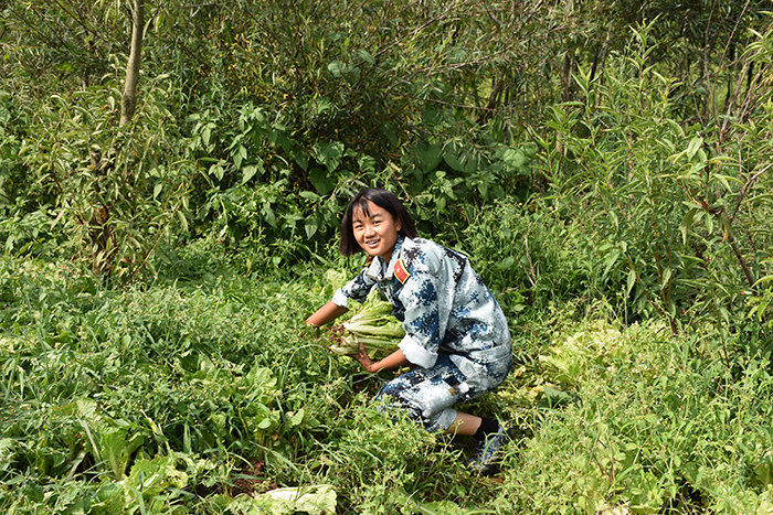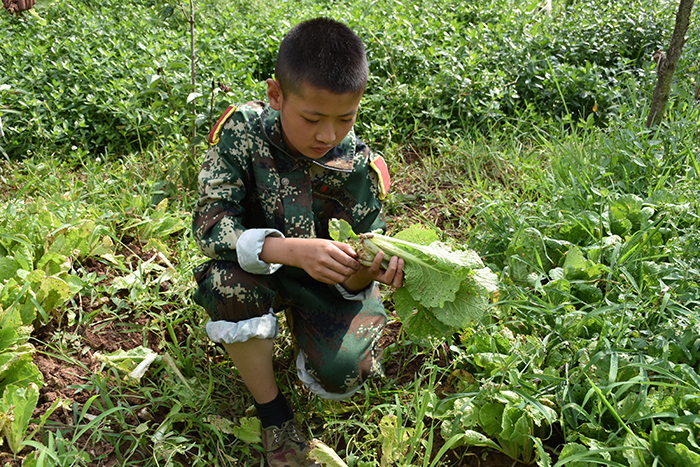 旁邊摘菜的同學也不甘示弱。他們小心翼翼地把小白菜連根拔起,細心地把根上的泥土和蔫了的部分去掉。不一會兒,也采摘到了滿滿兩大筐。