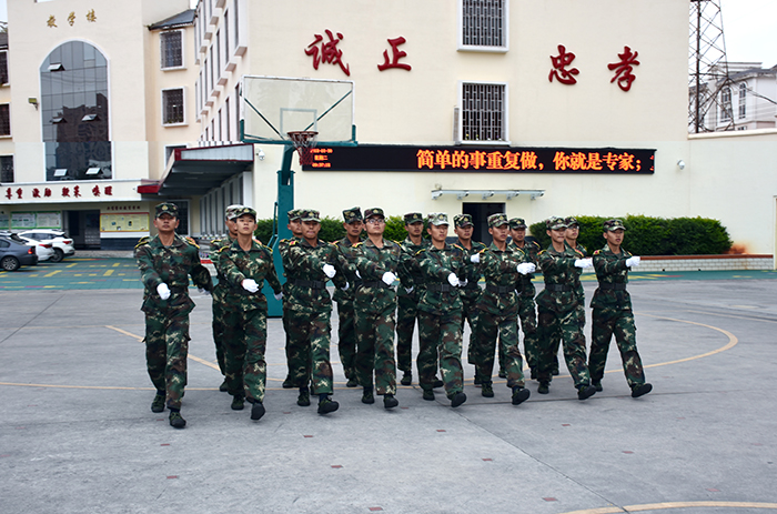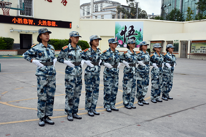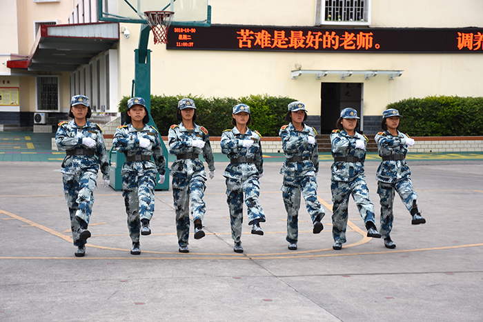 隨后,各方隊在教官的指揮下進行了分列式、應急棍、匕首操、擒敵拳、手語操、舞蹈等表演。同學們整齊的隊伍、精準的動作、昂揚的士氣、嘹亮的軍歌、優美的旋律、燃燒的激情贏得了陣陣掌聲。