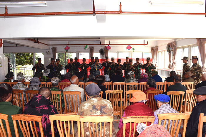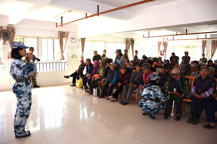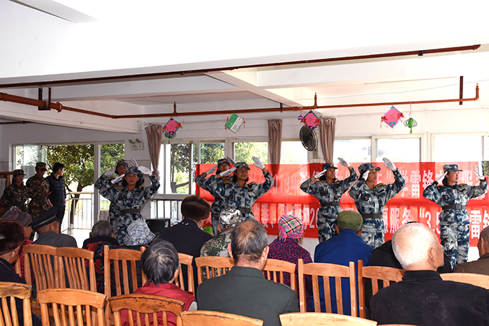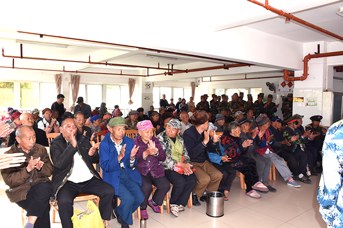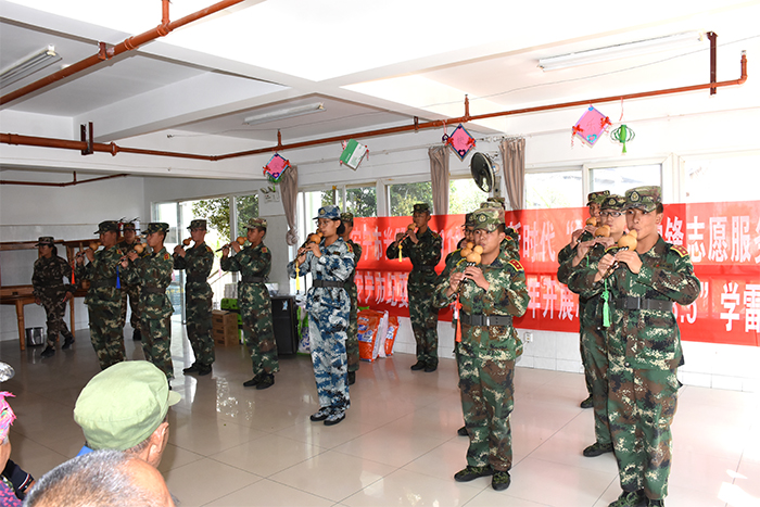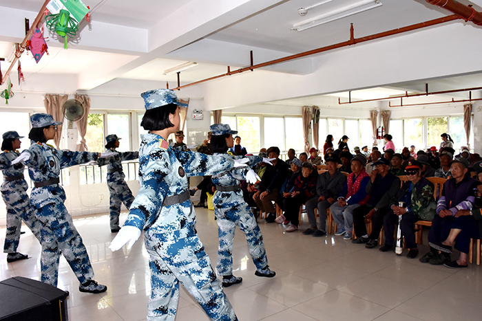 離別時,孩子們用在校所學的葫蘆絲為老人們演奏了《荷塘月色》,瀟灑歡快地表演了《女兵操》,有的孩子還大膽上臺深情獨唱《異鄉人》,來自深圳的同學則用純正的粵語演唱了《光輝歲月》,最后還一起唱響了《學習雷鋒好榜樣》,共同祝福老人們身體健康,平安快樂。老人們聽后非常感動,不約而同地為孩子們豎起了大拇指,敬老院里不時有歡聲笑語傳出,讓暖陽下的敬老院格外溫馨。