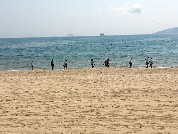 7日上午,孩子們又跑到海邊游泳,這或許是云南孩子特有的情愫。有的孩子穿著薄衣薄褲一步一步地邁入海中,眺望遠(yuǎn)方冉冉升起的太陽(yáng);有的又在海灘上狂熱地戲海逐浪;有的懶洋洋的躺在沙灘的躺椅上,瞇眼斜看著流金溢彩的沙灘,聽潮起潮落,一點(diǎn)也不擔(dān)心會(huì)被曬黑,甚至還有種想把自己曬得一身古銅色的小愿望。