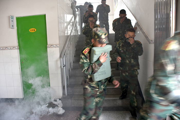 隨著毛副校長“防震減災應急疏散演練開始”的一聲令下,“地震警報”信號立即響起,學校迅速啟動避震應急機制,學生們在各班老師的組織下,迅速抱頭,有序地聽從樓層負責人指揮,按指定路線“逃生”,疏散到安全區域。避震演練結束,校園內火警模擬信號又隨即響起,學校消防疏散應急機制迅速啟動。學生們用枕頭、帽子或手袖捂住口鼻,彎著腰迅速撤離到安全區域。