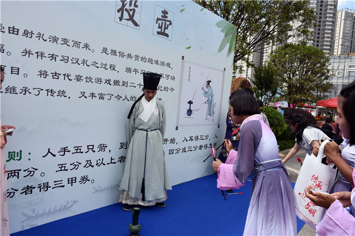 表演結束后,同學們還饒有興致地到遙岑樓書院參觀,臭美留影。隨后又興致勃勃地參加了 “旱地龍舟、投壺、漢服體驗”等多個端午主題游園游戲。孩子們玩得十分開心,每個游戲都全情投入,贏得了不少獎券,兌獎時,幸福難以言表;顒蛹染邐蕵沸,又更深入地踐行了時代文明新風,弘揚了中華傳統文化。