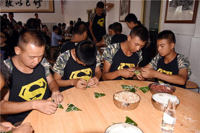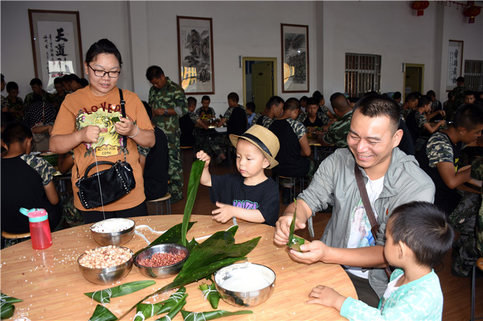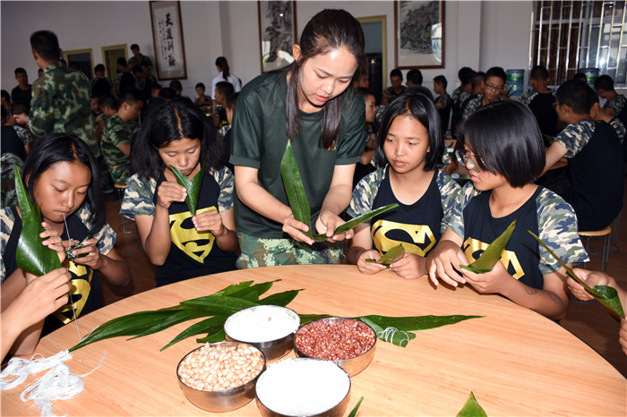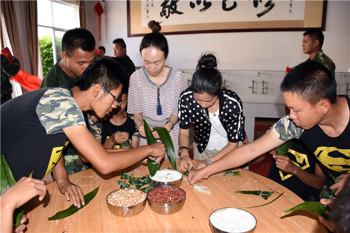 6月7日上午,全體師生在食堂忙碌又精心地準備著包粽子的材料。在老師的指導下,孩子們清洗粽葉、洗米剪繩、分裝糯米、花生、紅豆等餡料到不同桌子。不一會兒,所有材料就準備就緒,大家開始熱熱鬧鬧地包起了粽子。師生們把粽葉做漏斗狀、填糯米、放餡料、壓緊實、封口、彎腰拿繩綁好,有的選手全神貫注,一氣呵成;有的注重細節,精美扎實;有的拿出奇招,調整節奏,提高效率。一時間粽葉飛舞,絲線穿梭,一個個玲瓏而秀氣的粽子很快便誕生了。有三角狀的,有馬蹄型的,還有扁長型的......