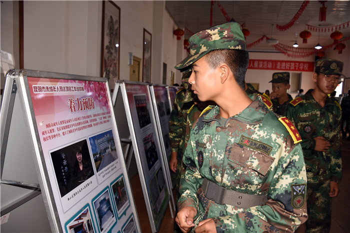 與此同時,昆明市關工委未成年人司法項目工作安寧巡展在多功能室也開展得如火如荼,學校師生跟隨領導們的腳步,在工作展板前認真聽取講解并仔細觀看。巡回展不僅展出了近幾年云南各地區未成年人司法項目實施的情況和取得的成效,還選取了典型案例以案釋法,直觀地展示了觸法犯罪的代價,有效地引導幫助學生從小樹立“學法、守法”的意識,強化法制觀念。