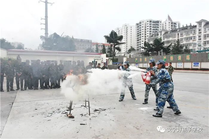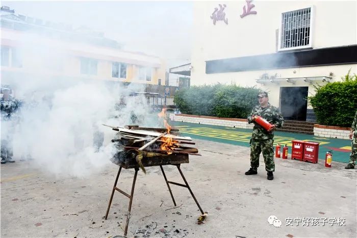 接著開始了消防撲救演練。操場上的木材點燃后,火苗迅速變成了熊熊大火,老師開始現場演示滅火設備(滅火器、高壓水槍、滅火毯、濕毛巾)的使用方法,并指導全部學生親自操作演練。