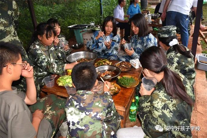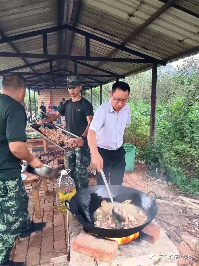 夕陽西下,孩子們在老師的帶領下準備晚餐。拾柴、生火、洗菜、炒菜......大家各展所長,整個草灘上變得熱鬧起來。不一會兒,一陣陣香味撲鼻而來,一盤盤讓人垂涎欲滴的菜肴便呈現在同學們眼前。“開席!”隨著尹校長的一聲令下,大家迅速行動起來,紛紛舞動著筷子,爭相品嘗著別樣的晚餐。
