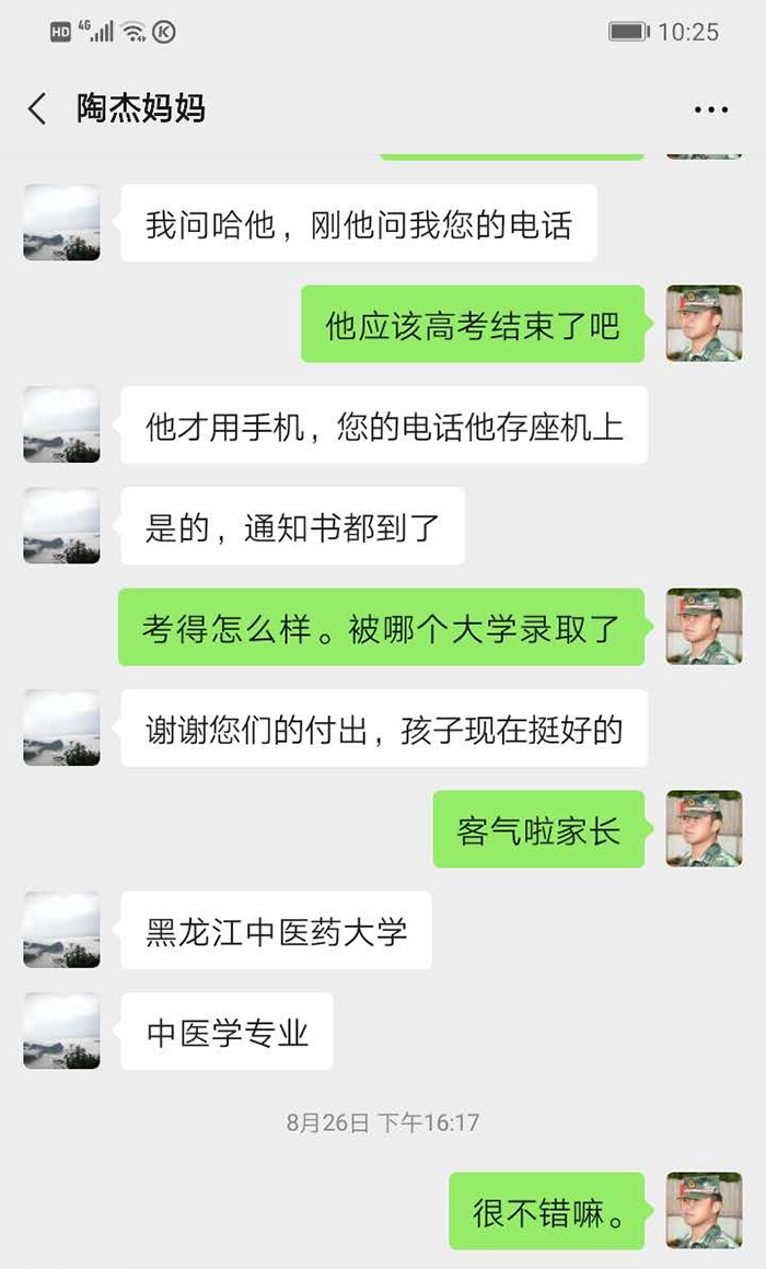 每年高考后,我校都是喜報頻傳,今年也不例外,我們接二連三地收到了多個學生金榜題名的好消息。這不,我校2018年優秀畢業生陶杰以理科580分的驕人成績被黑龍江中醫藥大學錄取!為感老師的培育情,近日,陶杰同學在開學前夕,特地回校報喜探望。
