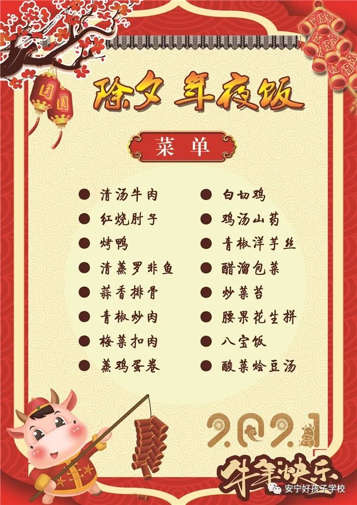 過年了 !孩子們吃什么?這是學校領導幾天來一直思考的問題。經過與學校營養師、食堂廚師們多次商議后,本著營養、健康、不浪費,又要保證孩子每餐都能吃上新鮮可口的飯菜,終于議定了菜單,現予以公布。祝孩子們新年快樂!祝全體家長萬事如意!