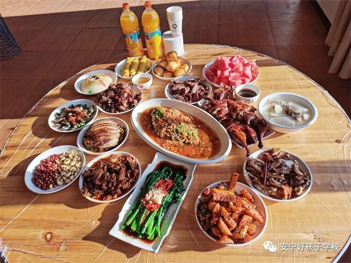 經過一天的忙碌,傍晚,孩子們幫著學校廚師們為師生精心準備的美食端上餐桌。