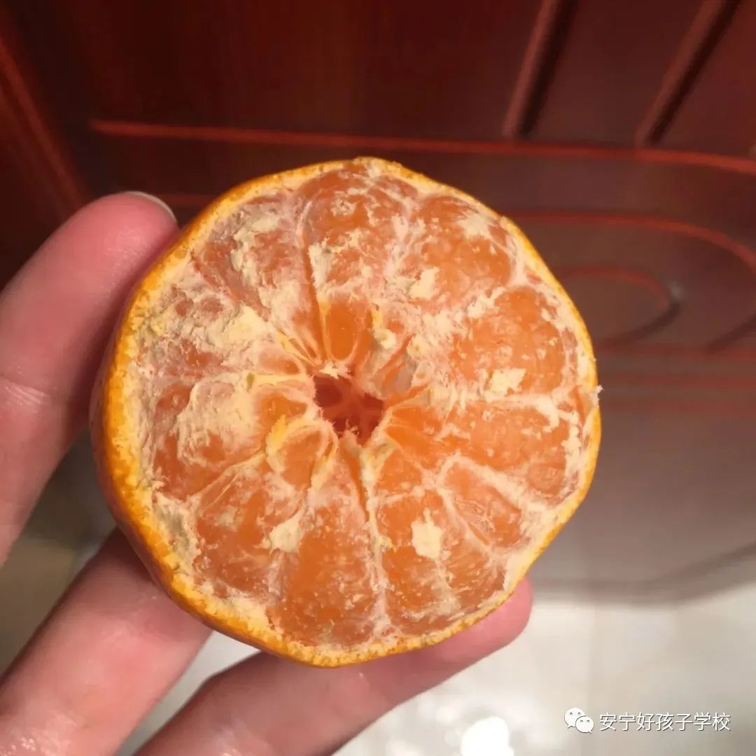 最后一個實驗是不剝開橘子皮,猜橘子的瓣數。同學們拿起橘子認真觀察,左看右看,轉著圈看,瞇著眼看,對著光看......或猶豫或堅定地說出自己猜的數字,然后剝開橘子看是否和自己猜的數字吻合。同學們有的猜對(或者說是蒙對),有的相差較大,但老師卻一猜一個準。正當同學們非常好奇老師是怎么做到的時候,老師便為大家揭曉答案:每個橘子上都有個綠梗,將橘子蒂頭整個剝掉,能看到一圈小白點,白點多少個,橘子就有多少瓣(但若發現2個白點中間空出一個位置,或有那種似有非有的白點,大可能就是沒發育好的橘子瓣)。同學們恍然大悟,原來小小的橘子里面還隱藏著這樣的奧妙呢!