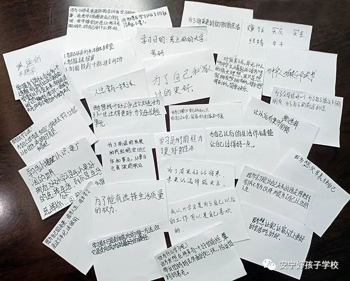 課程伊始,張老師首先通過“你為什么學習?”這一簡單提問,單刀直入、切入主題,孩子們若有所思,爭相發言。隨后張老師又和孩子們進行互動,要求孩子們在收到的小紙片上以匿名的方式寫下自己的想法。孩子們在紙片上暢所欲言,有的回答簡單直白,有的充滿童趣,有的誠懇務實。張老師挑選了部分答案進行分享,課堂氛圍活躍了起來,孩子們熱情高漲。
