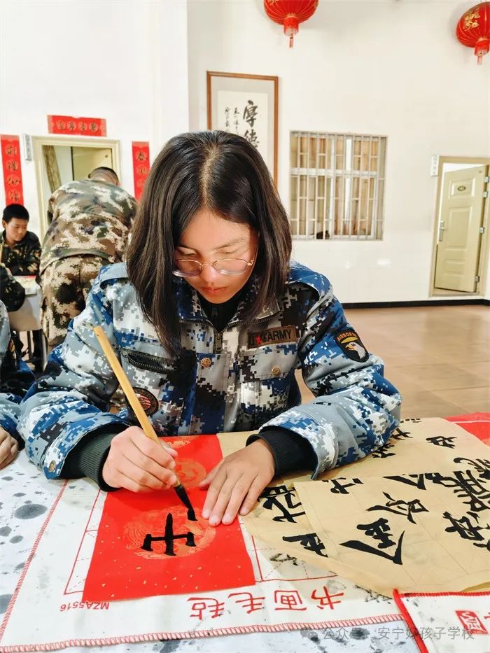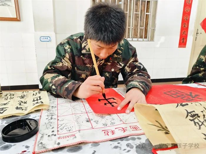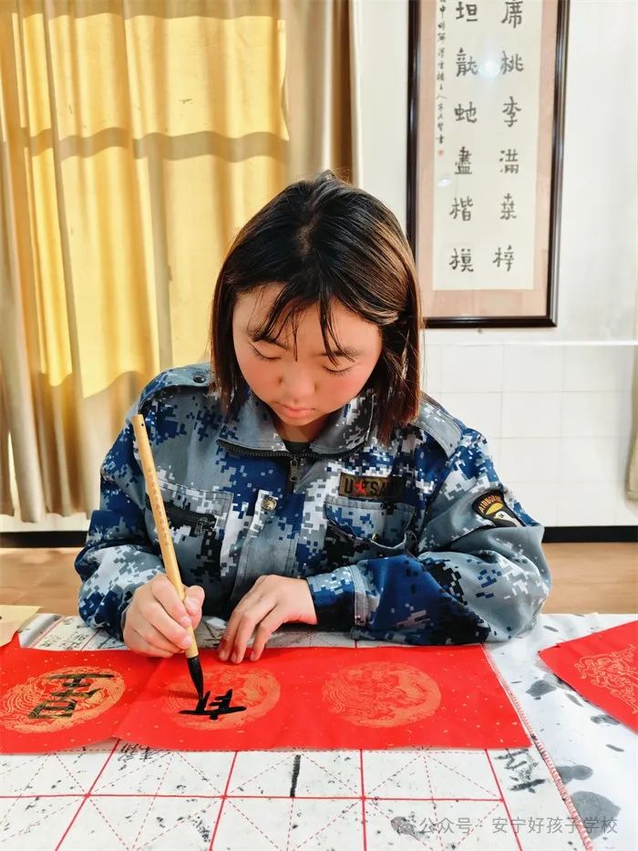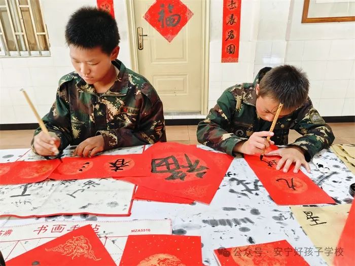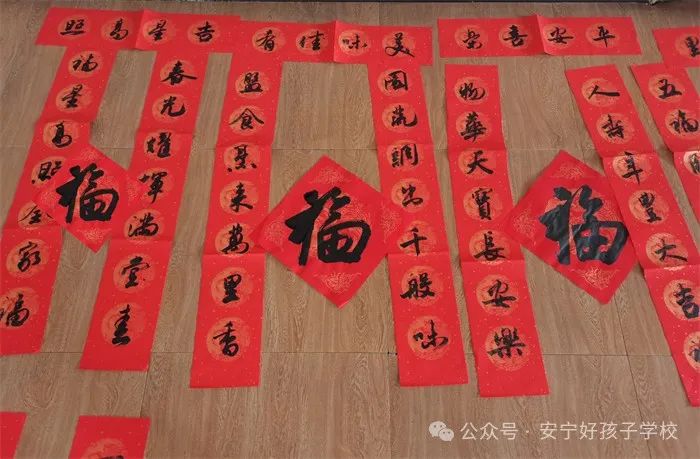 在窗明幾凈的多功能室里,翰墨飄香,福氣滿堂,孩子們徜徉其中,用心地選聯句、飽蘸濃墨、潤圓筆鋒、提筆揮毫。經過2個多小時的奮筆疾書,孩子們都完成了屬于自己的春聯作品。“春臨大地花開早,福滿人間喜事多”“日麗神州彩鳳舞,霞飛華夏巨龍騰”“天地人四海同春,松竹梅三陽開泰”“一帆風順年年好,萬事如意步步高”等滿載祝福的春聯躍然紙上。隸書的有折無轉、楷書的齊而不拘、草書的筆畫連綿、行書的悠游流轉......大家筆走龍蛇,作品行云流水,都肆意地將心底最美好的祝愿化作一幅幅寓意吉祥的作品,在漢字的線條美與結構美之中傳遞著濃郁的辭舊迎新、接福納祥的新春祝福。