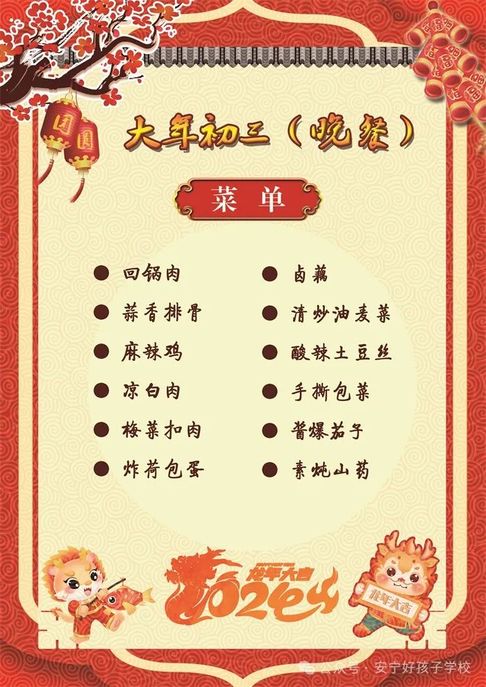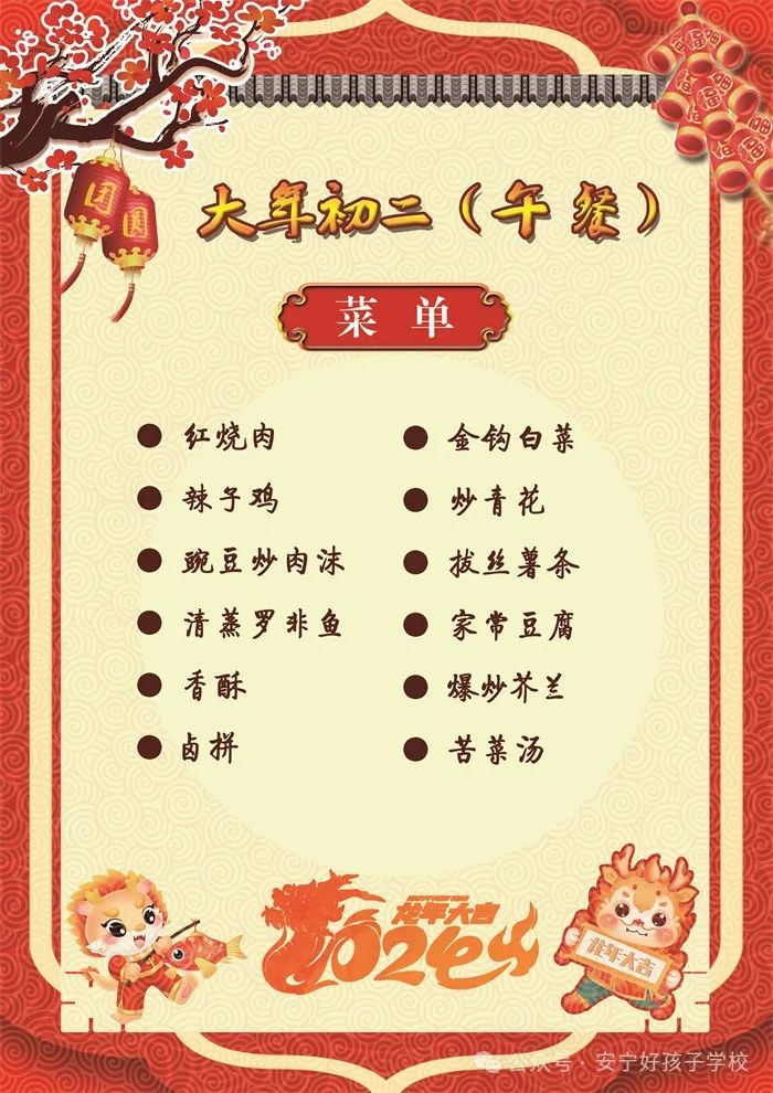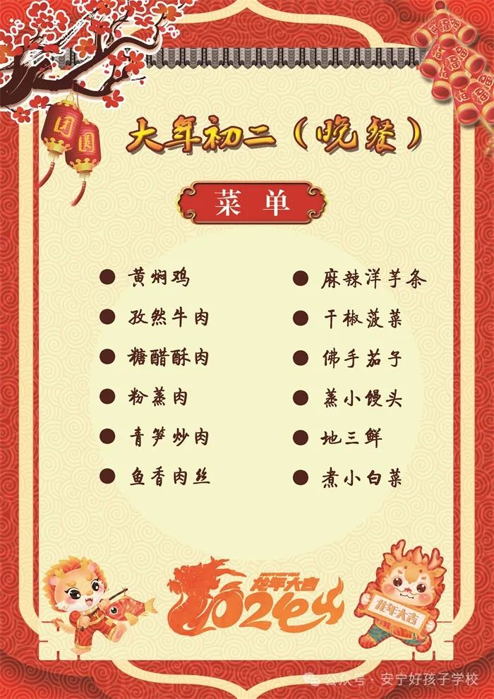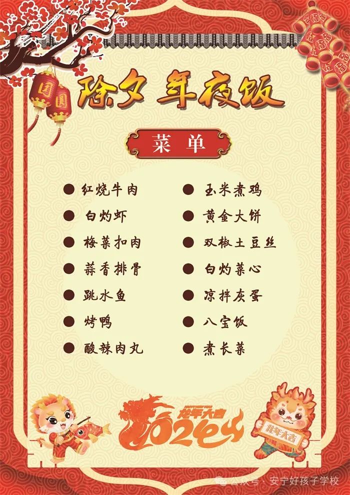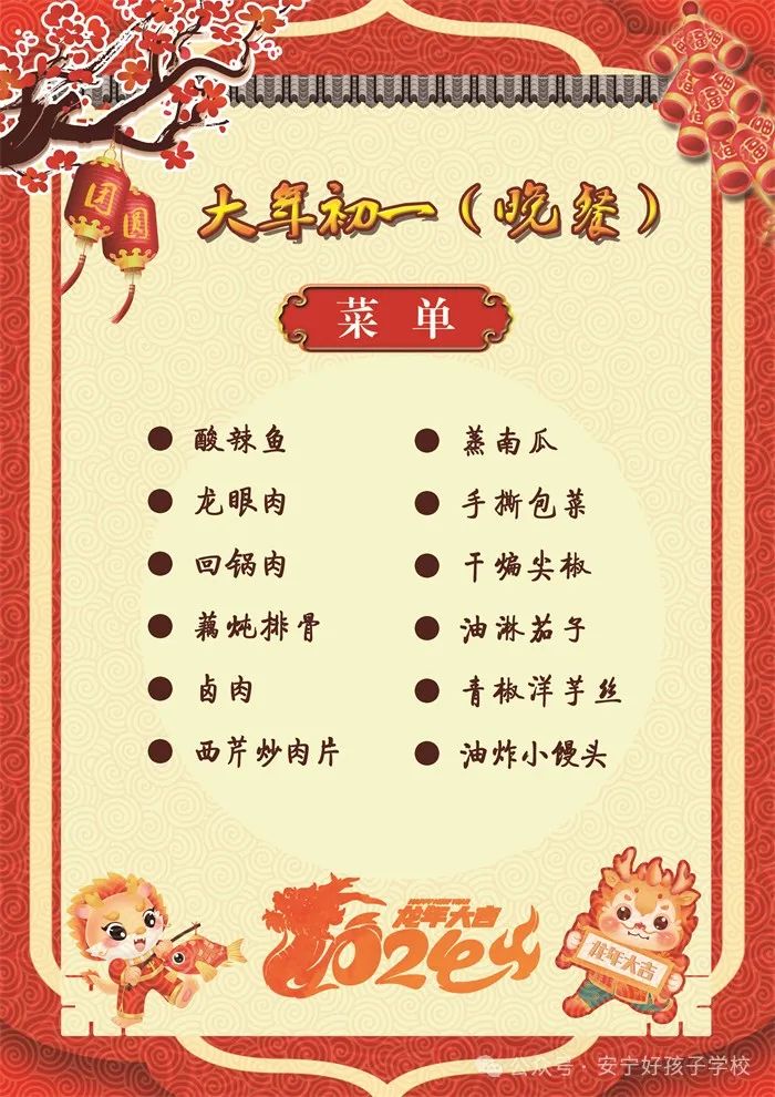 過年了 !孩子們吃什么?這是學校領導幾天來一直思考的問題。經過與學校營養師、食堂廚師們多次商議后,本著營養、健康、不浪費,又要保證孩子每餐都能吃上新鮮可口的飯菜,終于議定了菜單,現予以公布。祝孩子們新年快樂!祝全體家長龍年吉祥、闔家幸福安康!